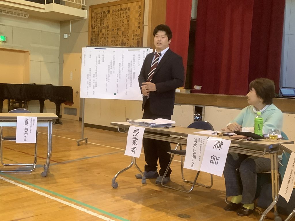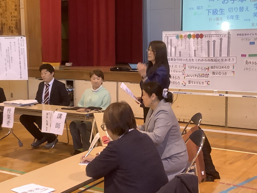 講師には、全国学校行事研究会の元会長であり、八王子学園なかよし幼稚園の園長の清水 弘美先生をお招きしました。今日の授業への指導・助言、特別活動の指導原理が非認知能力を伸ばし、自分の人生を自分で切り拓く資質・能力を育んでいることを教えていただきました。